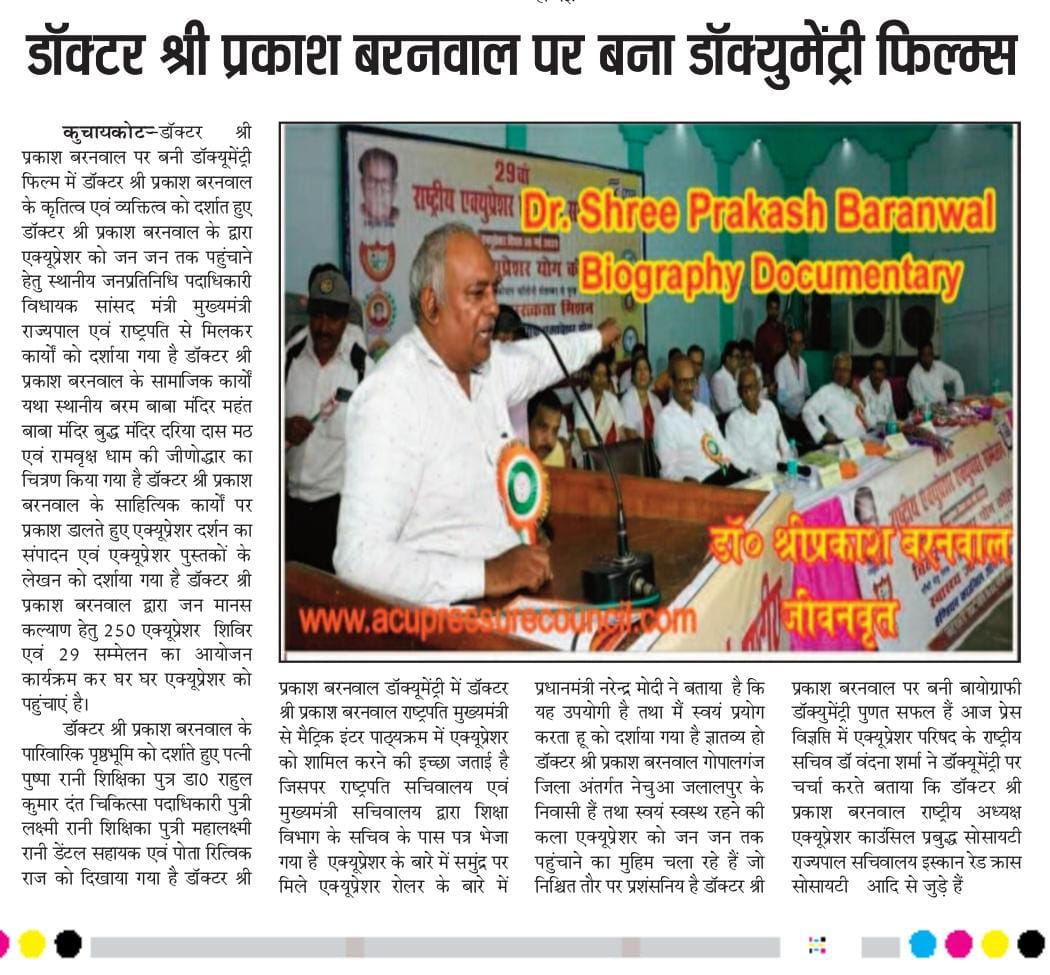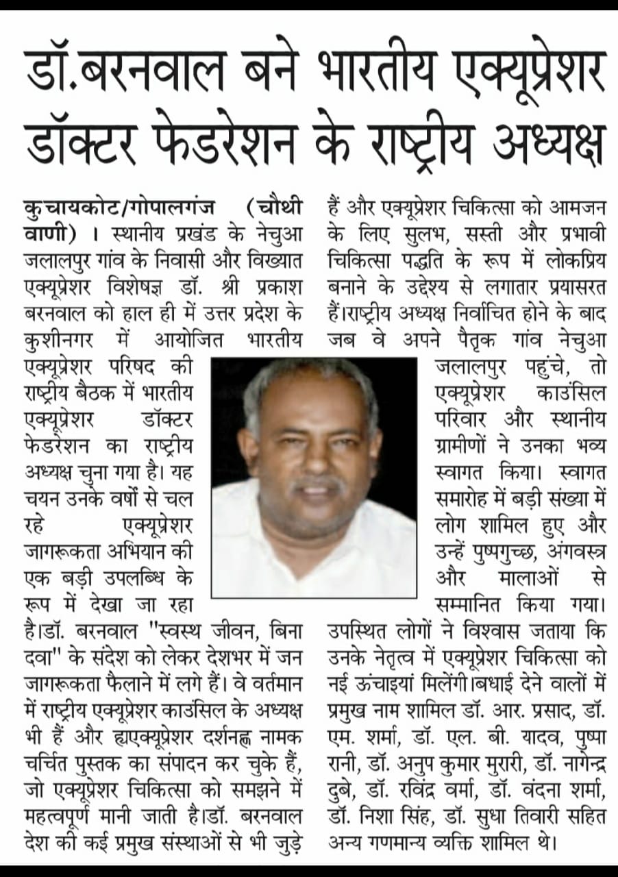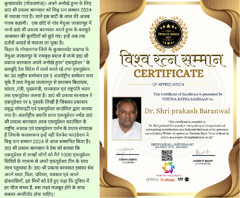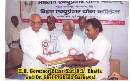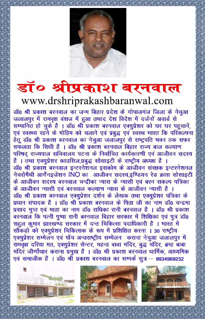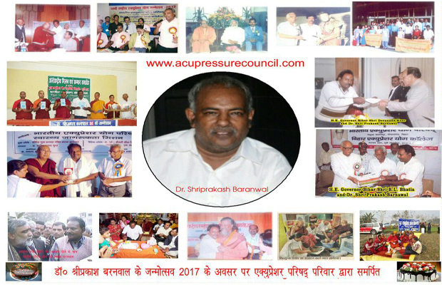 Dr. Shri Prakash Baranwal widely regarded as pioneer of the Acupressure holistic Movement in India, the founder Acupressure Council , Director in chief, International Board of Alternative Medicine & Naturopathy, Founder secretary of Pra Budh Acupressure yoga naturopathy centre and founder of "Shri Acupressure yantra" for health and "Shri Yantra"for wealth and happiness. life member Red Cross Society and Chairman prabudh Society. Dr. Shri Prakash Baranwal is also an internationally renowned Acupressure Massage Practioner,and founder of Bhartiya Acupressure Dal and organizer, author and visiting Professor of open International university for complimentary medicine, Colombo, Promotar of Indian Acupressure and Life Patron of ISCKON. Dr. Shri Prakash Baranwal is chief editor of Acupressure yoga Darshan and Life Member of Bihar State Council for Child Welfarea Raj Bhawan, Bihar, He is also a author of Acupressure Book besides having articles published in leading News papers and magazines of the country and has also actively participated in number of National and international conferences. Dr. Baranwal has organized 25 successful national conferences and 250 free camps which greatly having received the blessings and well wishers of the H.E. President of India, Hon'ble Prime Minister, Hon'ble Health Minister H.E. Governors, Hon'ble Chief Minister, Hon'ble Ministers , Hon'ble Judges, HH. Lama gangehen, HH B. Gyaneshwar jee, IAS, IPS, V.I.P. national & International Social men and Doctors. Dr. Baranwal has organized Training cim treatment camptime to time.