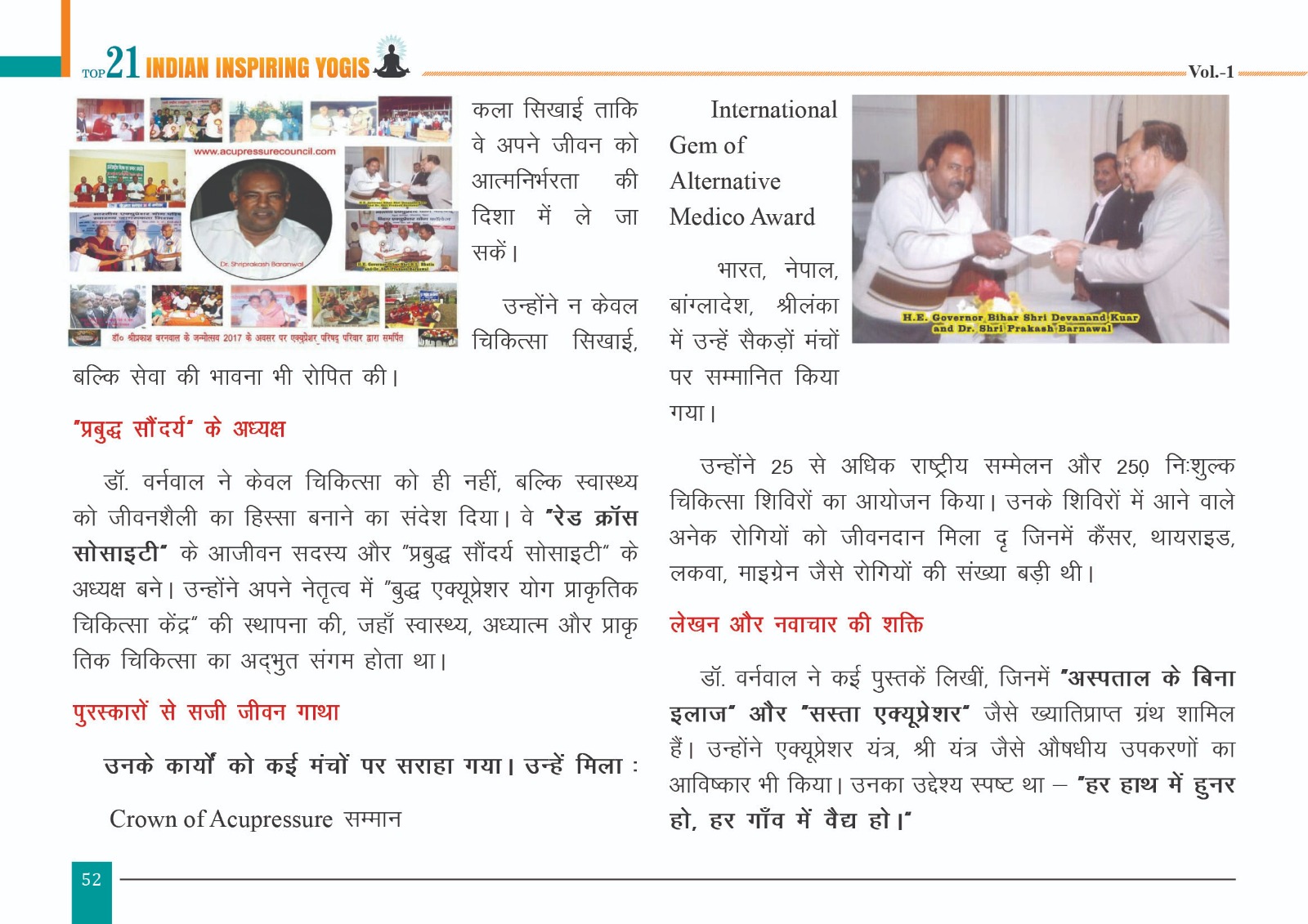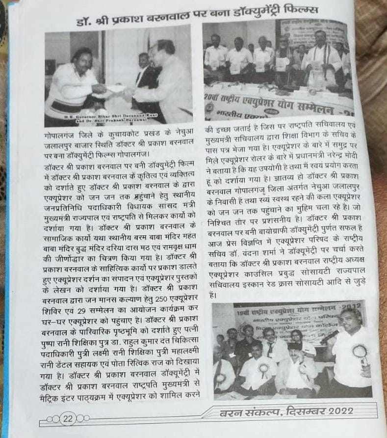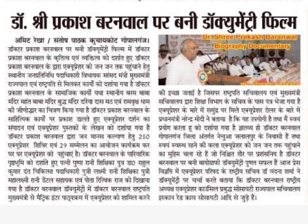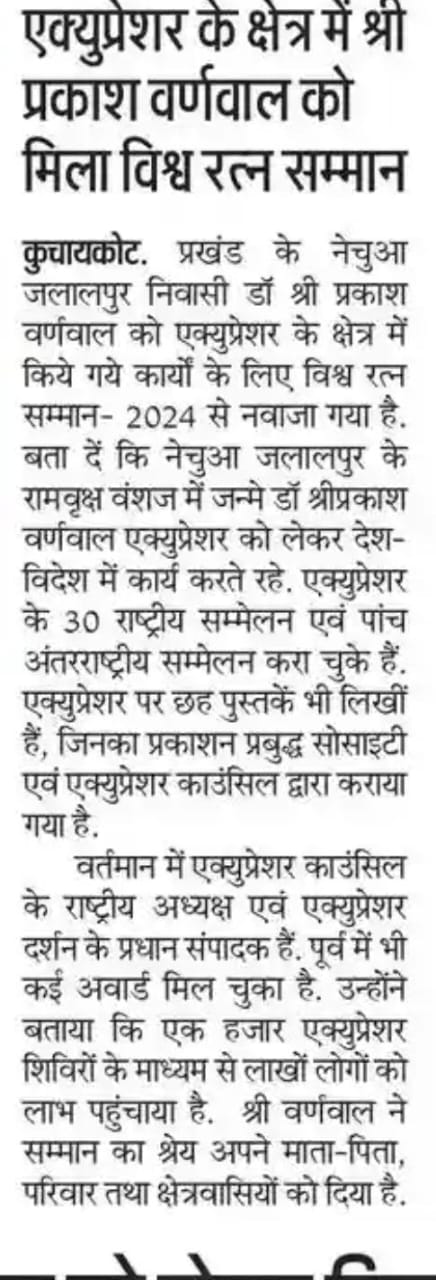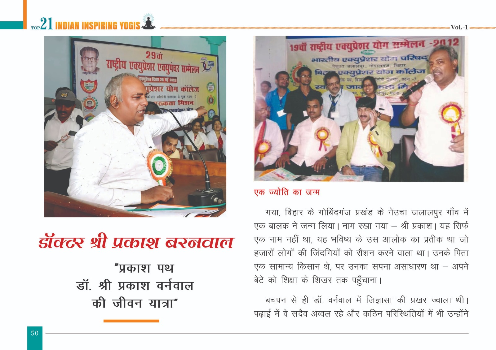 Dr. Shri Prakash Baranwal widely regarded as pioneer of the Acupressure holistic Movement in India, the founder Acupressure Council , Director in chief, International Board of Alternative Medicine & Naturopathy, Founder secretary of Pra Budh Acupressure yoga naturopathy centre and founder of "Shri Acupressure yantra" for health and "Shri Yantra"for wealth and happiness. life member Red Cross Society and Chairman prabudh Society. Dr. Shri Prakash Baranwal is also an internationally renowned Acupressure Massage Practioner,and founder of Bhartiya Acupressure Dal and organizer, author and visiting Professor of open International university for complimentary medicine, Colombo, Promotar of Indian Acupressure and Life Patron of ISCKON. Dr. Shri Prakash Baranwal is chief editor of Acupressure yoga Darshan and Life Member of Bihar State Council for Child Welfarea Raj Bhawan, Bihar, He is also a author of Acupressure Book besides having articles published in leading News papers and magazines of the country and has also actively participated in number of National and international conferences. Dr. Baranwal has organized 25 successful national conferences and 250 free camps which greatly having received the blessings and well wishers of the H.E. President of India, Hon'ble Prime Minister, Hon'ble Health Minister H.E. Governors, Hon'ble Chief Minister, Hon'ble Ministers , Hon'ble Judges, HH. Lama gangehen, HH B. Gyaneshwar jee, IAS, IPS, V.I.P. national & International Social men and Doctors. Dr. Baranwal has organized Training cim treatment camptime to time.
