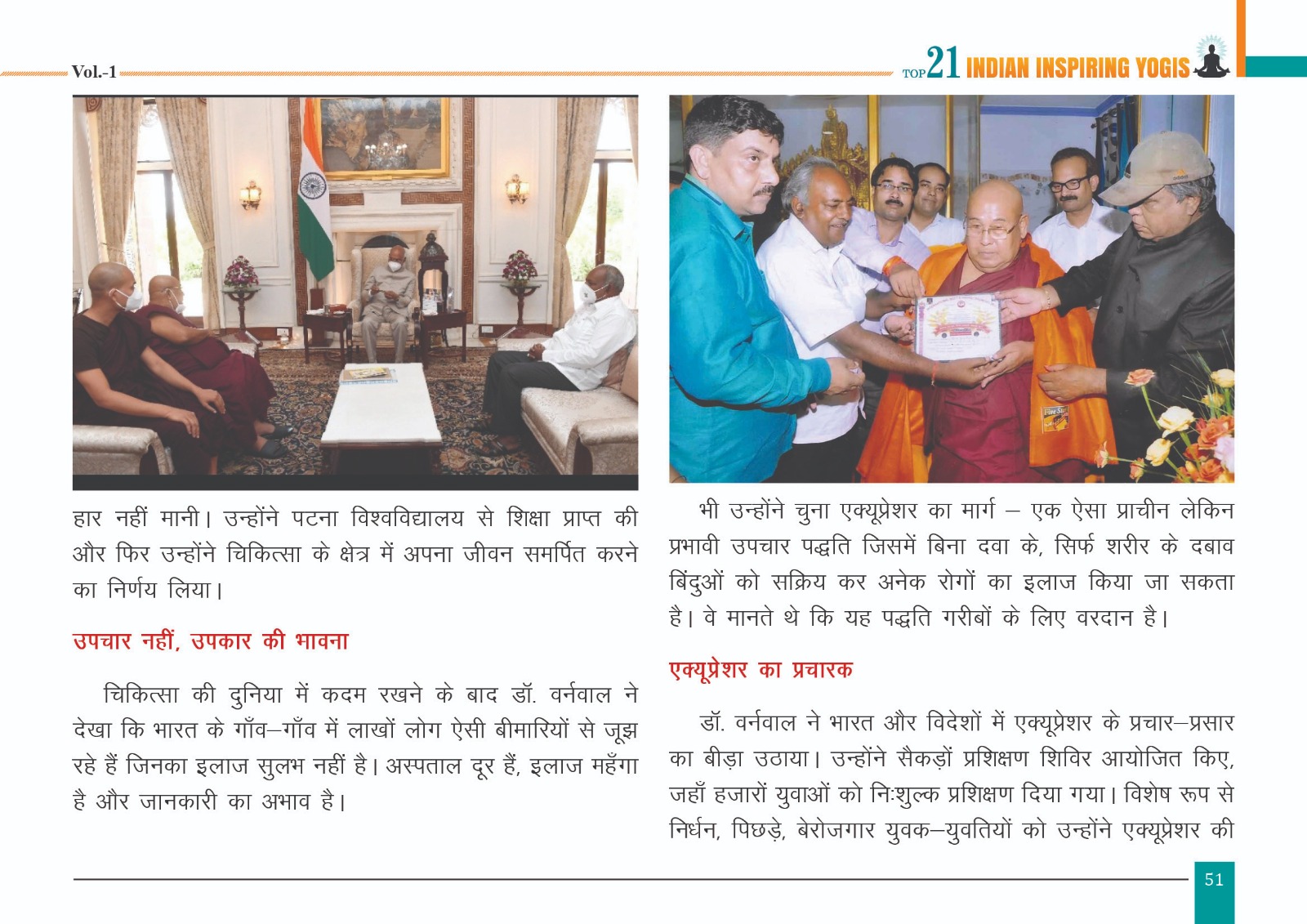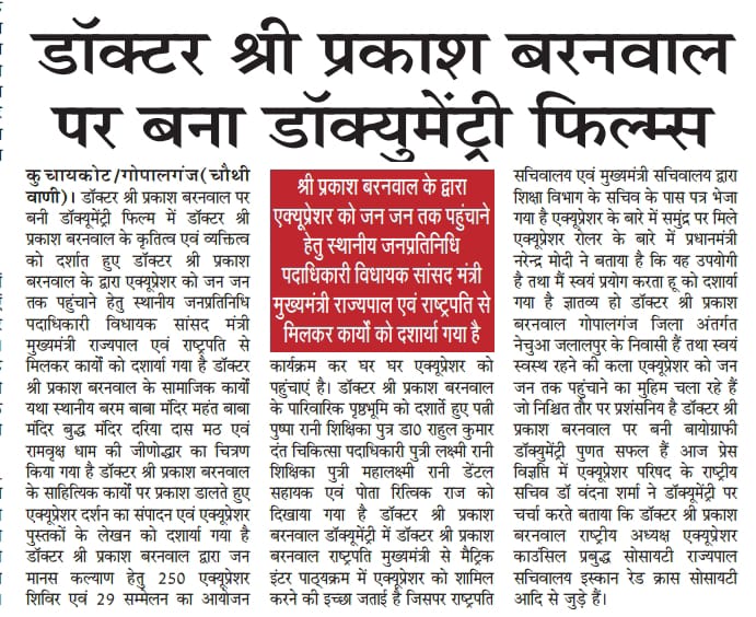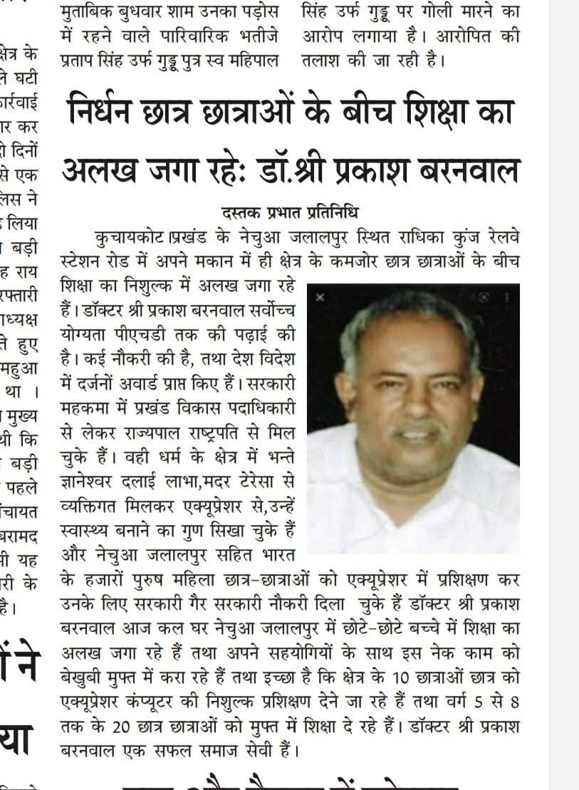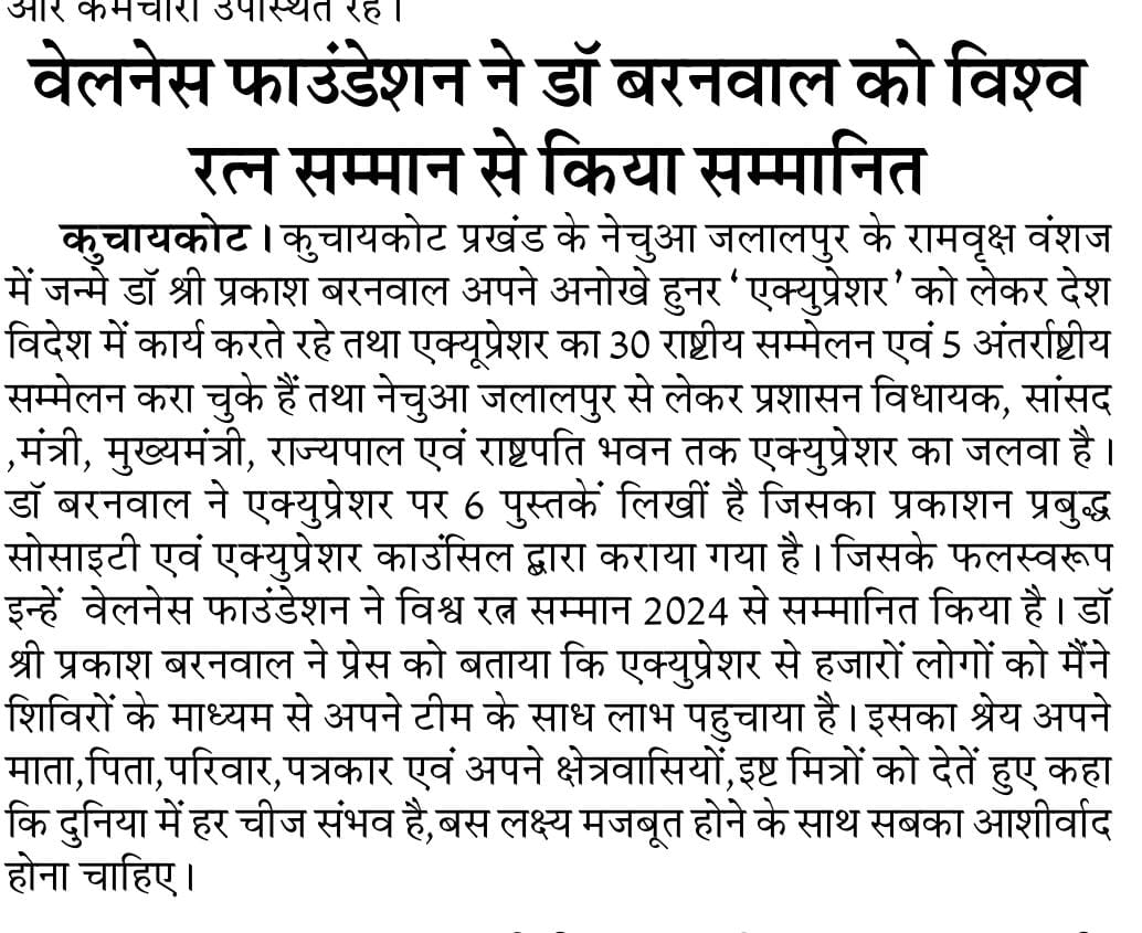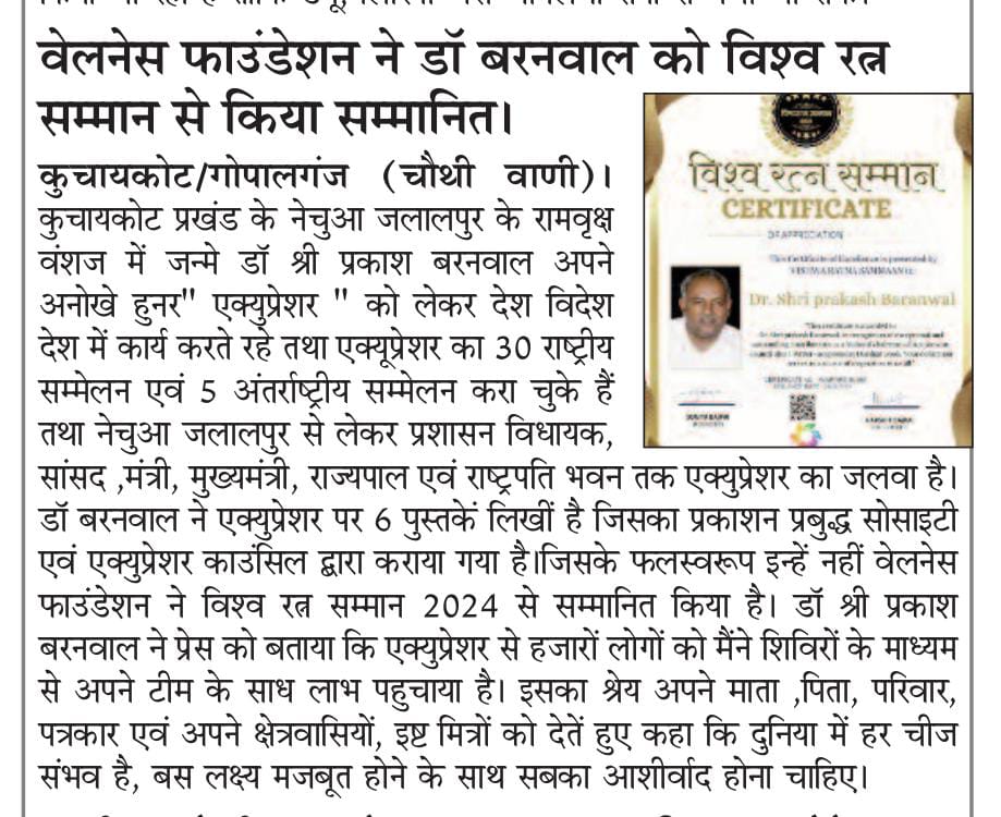 Dr. Shri Prakash Baranwal widely regarded as pioneer of the Acupressure holistic Movement in India, the founder Acupressure Council , Director in chief, International Board of Alternative Medicine & Naturopathy, Founder secretary of Pra Budh Acupressure yoga naturopathy centre and founder of "Shri Acupressure yantra" for health and "Shri Yantra"for wealth and happiness. life member Red Cross Society and Chairman prabudh Society. Dr. Shri Prakash Baranwal is also an internationally renowned Acupressure Massage Practioner,and founder of Bhartiya Acupressure Dal and organizer, author and visiting Professor of open International university for complimentary medicine, Colombo, Promotar of Indian Acupressure and Life Patron of ISCKON. Dr. Shri Prakash Baranwal is chief editor of Acupressure yoga Darshan and Life Member of Bihar State Council for Child Welfarea Raj Bhawan, Bihar, He is also a author of Acupressure Book besides having articles published in leading News papers and magazines of the country and has also actively participated in number of National and international conferences. Dr. Baranwal has organized 25 successful national conferences and 250 free camps which greatly having received the blessings and well wishers of the H.E. President of India, Hon'ble Prime Minister, Hon'ble Health Minister H.E. Governors, Hon'ble Chief Minister, Hon'ble Ministers , Hon'ble Judges, HH. Lama gangehen, HH B. Gyaneshwar jee, IAS, IPS, V.I.P. national & International Social men and Doctors. Dr. Baranwal has organized Training cim treatment camptime to time.